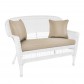 White Wicker Patio Love Seat With Tan Cushion and Pillows